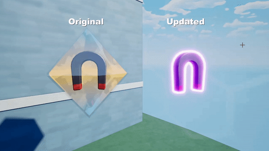 So my first step was to come up with a better design. This ended up being surprisingly difficult, as the pickup needs to be clearly visible against all sorts of backgrounds, as well as readable from far away and potentially from any angle. In the end, I kept things very simple, just adding a glowing border around the powerup itself. The contrast between the bright purple and the darker color of the powerup is easy to see, and I quite like it. There was a slight issue where the border would get too thin when the pickup was far away, but I solved that by expanding the border material based on distance to the camera. From there, I just added some simple particle effects and a dash of screen shake, and we were good to go.
