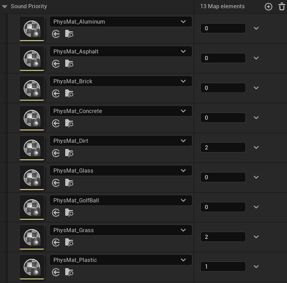 That was disappointing, but I decided to just make my own instead. So, my newly dubbed “CollisionSFXManager” is notified whenever a collision occurs, looks at the objects involved, and plays the corresponding sound effect. I came up with a simple but effective priority system, where softer materials will have priority over harder ones. This way, if a stone falls in the grass, you get a nice soft rustle and not a sharp clack.